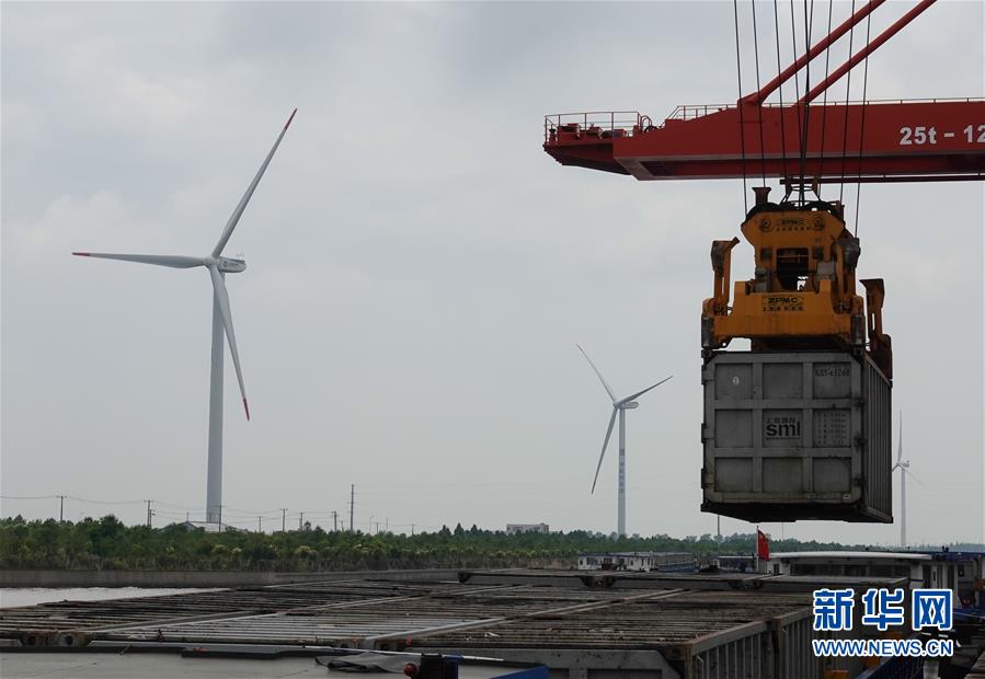 7月5日,在上海老港再生能源利用中心码头,龙门吊吊装由城市转运中心运送来的集装箱,集装箱内装有已经过分类和压缩处理的生活垃圾。 新华社记者 陈君清 摄