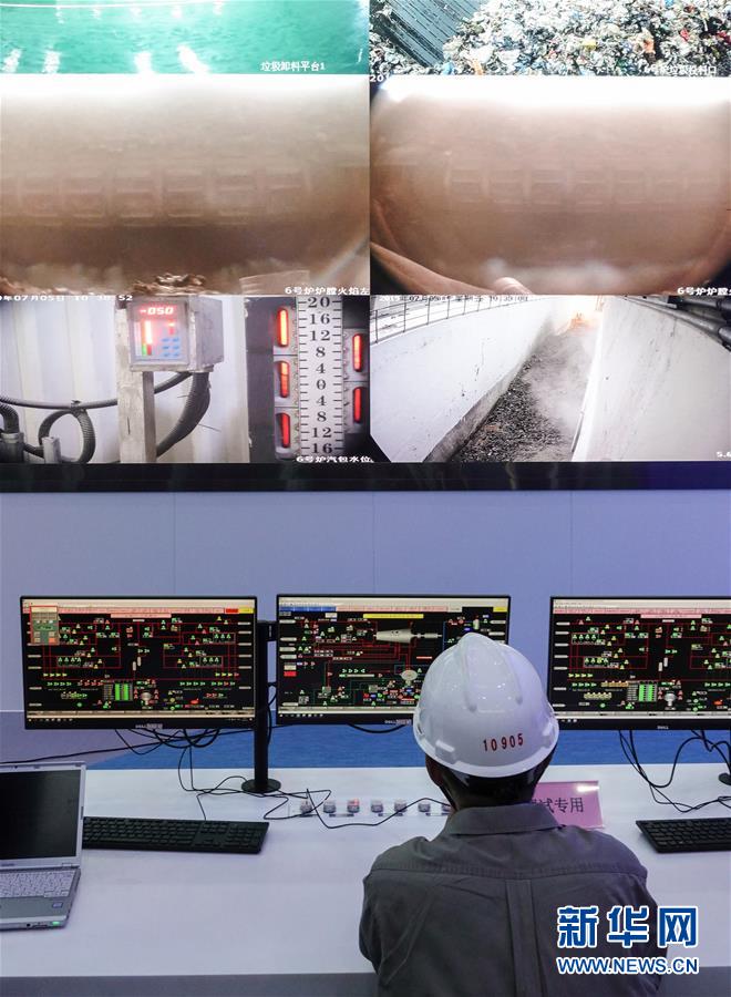 7月5日,工人在上海老港再生能源利用中心二期总控室内通过屏幕监控垃圾焚烧流程。 新华社记者 陈君清 摄