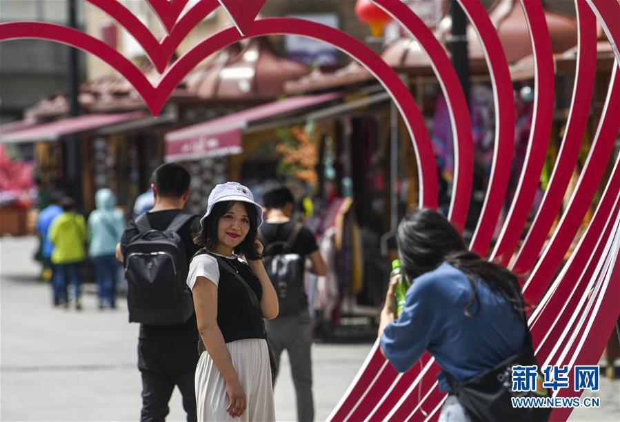 7月5日,游客在大巴扎景区步行街拍照留念。 新华社记者 赵戈 摄