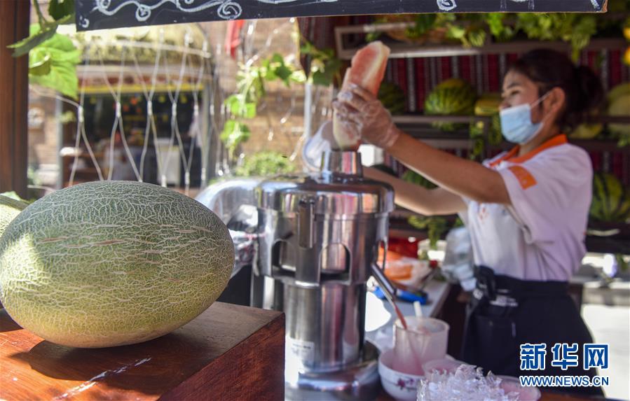 7月5日,大巴扎景区里的商贩为游客制作果汁。 新华社记者 赵戈 摄