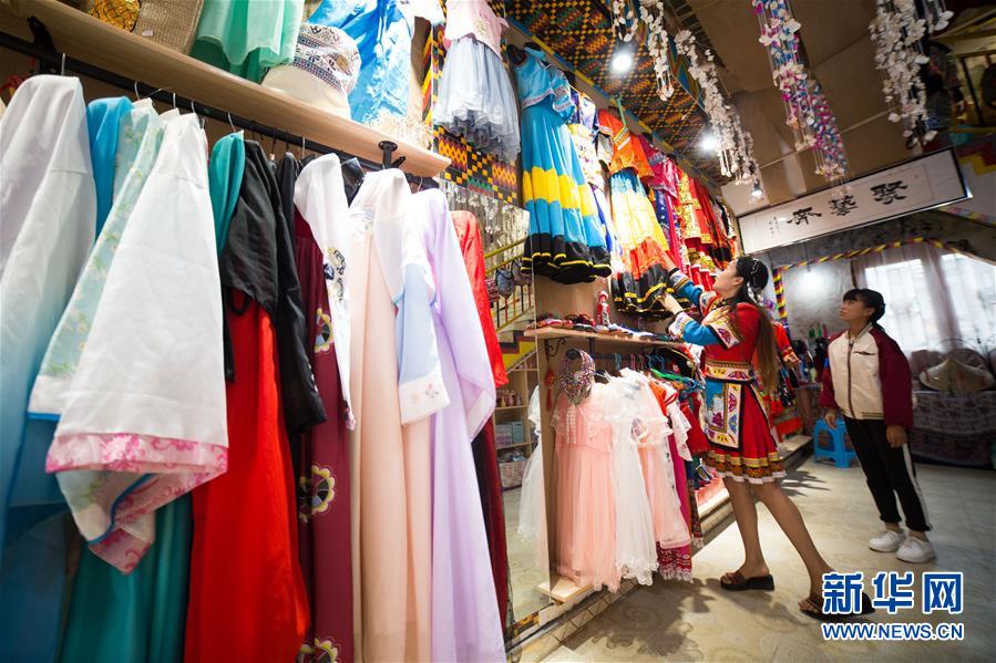 7月4日,在贵州省毕节市大方县奢香古镇聚民艺彝族文化服饰店,龙恩碧(左)在整理店内服饰。 新华社发(罗大富 摄)