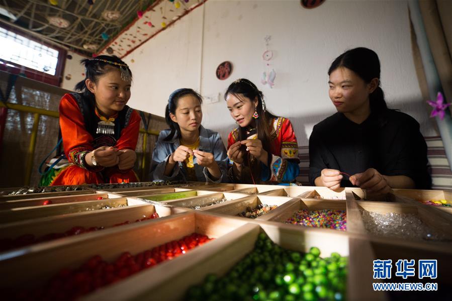 7月4日,在贵州省毕节市大方县奢香古镇聚民艺彝族文化服饰店,龙恩碧(右二)在教村民制作饰品。新华社发(罗大富 摄)