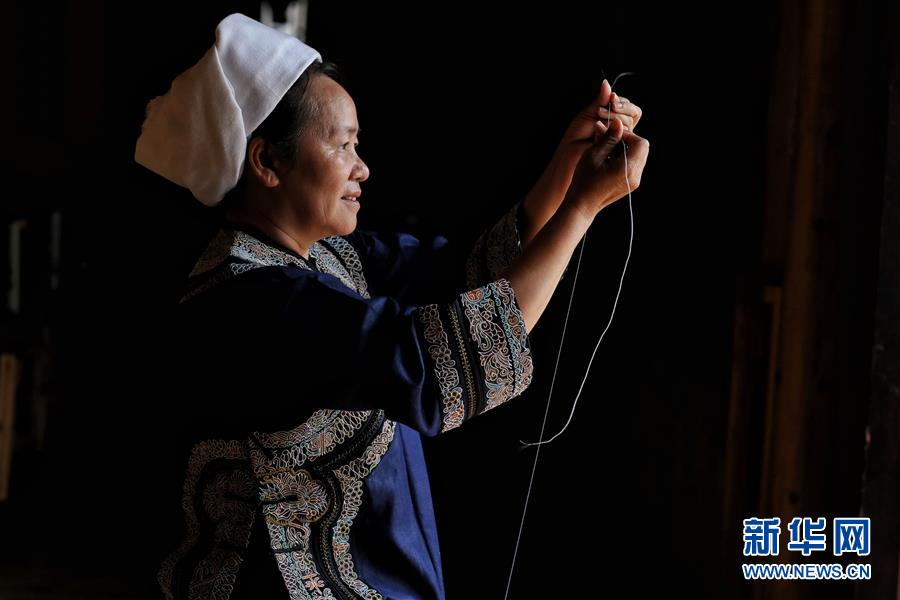 7月6日,在贵州三都水族自治县,水族马尾绣非遗传承人韦桃花在马尾上缠绕丝线。 水族马尾绣,是以丝线缠裹马尾盘在描绘好的花纹轮廓上,再根据轮廓线绣出各种图案,工艺复杂,具有很高的艺术价值,是国家级非物质文化遗产。它是水族妇女世代传承的一种特殊刺绣技艺,被称为中国刺绣的“活化石”。 新华社记者欧东衢摄