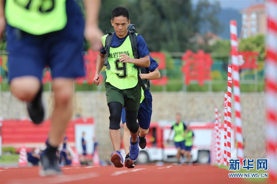 7月6日,在福建龙岩消防训练基地,参赛队员在进行负重5000米跑项目比拼。 新华社发(周杨东 摄)