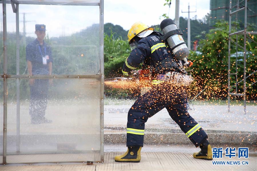7月6日,在福建龙岩消防训练基地,一名消防队员利用无齿锯切割钢板。 新华社发(周杨东 摄)