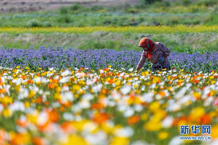 7月6日,甘肃省高台县新坝镇红沙河村村民在花田中劳作。 新华社发(钟晓亮 摄)