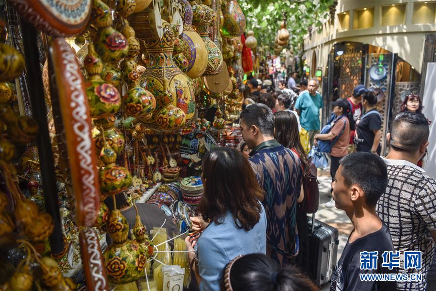 游客在乌鲁木齐国际大巴扎挑选工艺品(7月5日摄)。 夏日的新疆乌鲁木齐绿树依依,花开满城,市民和游客在这里享受着惬意的生活。 新华社记者 赵戈 摄