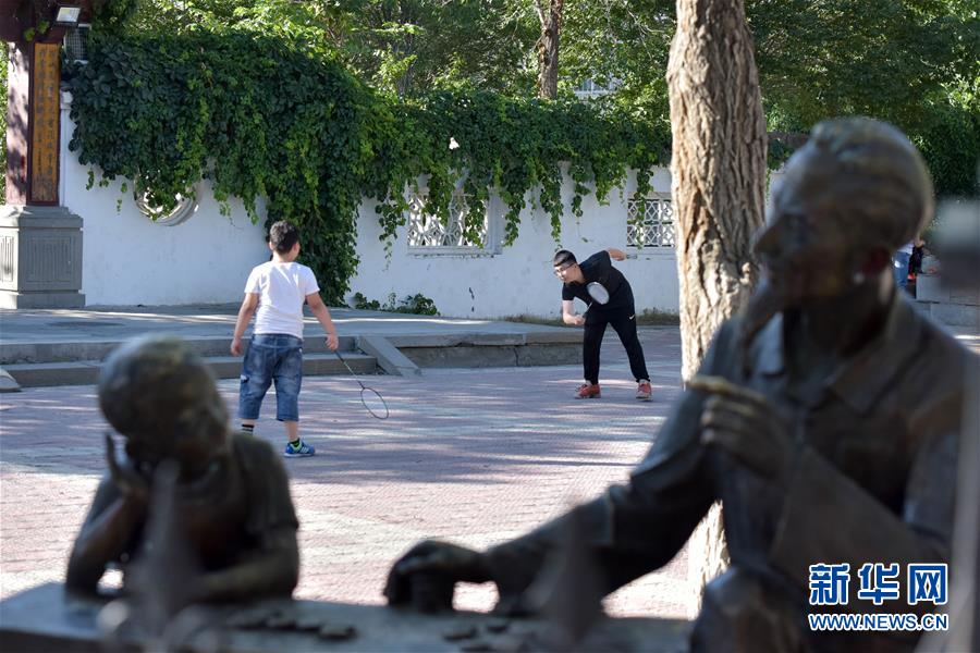 7月5日,在乌鲁木齐市一小区内,两名学生在打羽毛球。 夏日的新疆乌鲁木齐绿树依依,花开满城,市民和游客在这里享受着惬意的生活。 新华社记者 丁磊 摄