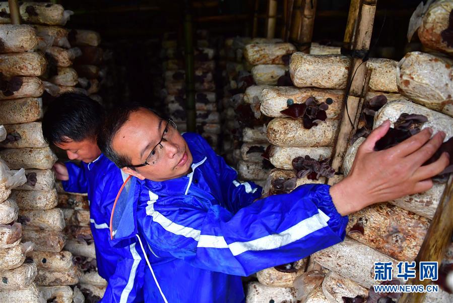 在党鸠村木耳种植基地,驻村扶贫工作队员陈令贤(右)在采摘木耳(7月6日摄)。 新华社记者 黄孝邦 摄