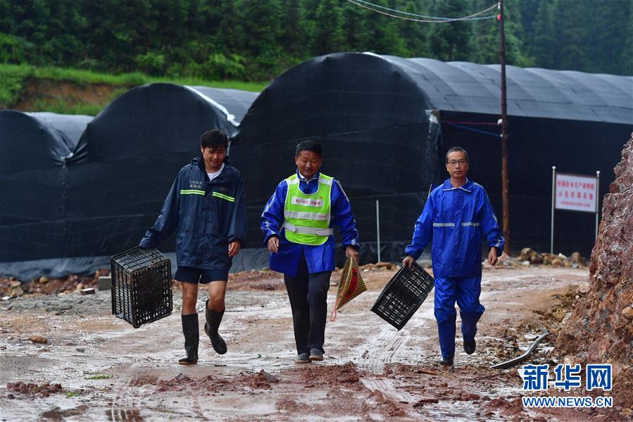 在党鸠村木耳种植基地,驻村第一书记韦桂华(中)和扶贫工作队员黄鼎业(左)、陈令贤前去采摘木耳(7月6日摄)。 新华社记者 黄孝邦 摄
