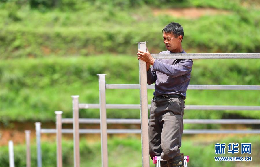 贫困户梁玉金在党鸠村木耳种植基地搭建大棚(6月2日摄)。 新华社记者 黄孝邦 摄