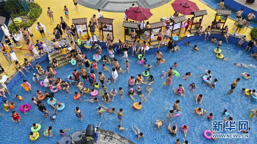 7月7日,市民在安徽省亳州市一水上乐园戏水(无人机拍摄)。 当日是小暑节气,人们通过各种形式消暑、娱乐。 新华社发(刘勤利 摄)
