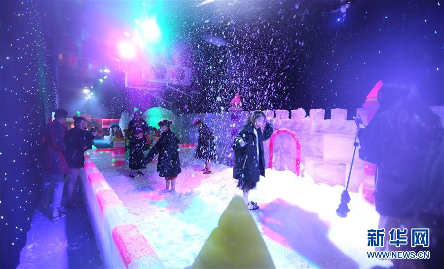 7月7日,市民在浙江省瑞安市一冰雕展上玩耍。 当日是小暑节气,人们通过各种形式消暑、娱乐。 新华社发(庄颖昶 摄)