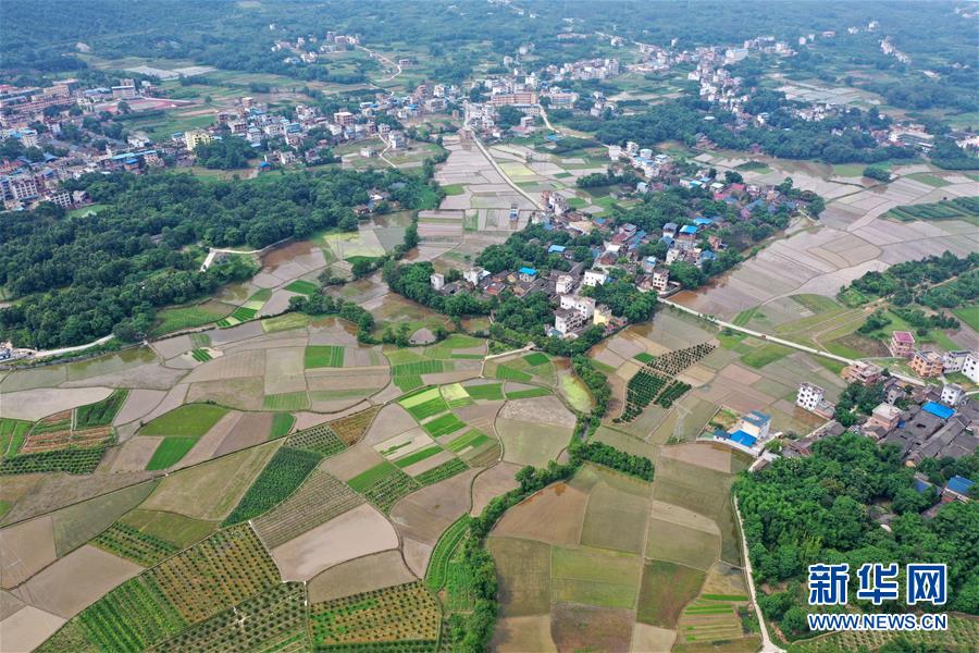 这是广西全州县凤凰镇凤凰嘴渡口附近的田园(6月29日无人机拍摄)。 1934年底,中央红军进入广西,打响著名的湘江战役。近日,记者来到战役发生旧址,看到这里历经几十年的耕耘,已经变得山川秀丽,田园秀美,一派生机勃勃的景象。 新华社记者 陆波岸 摄
