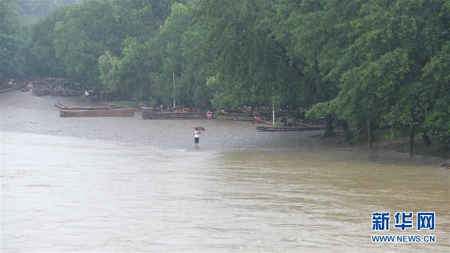 7月7日,在福建武夷山景区竹筏码头,一名景区工作人员在察看水情。 7月3日至7日,福建省经历了一轮连续强降雨。预计7至11日,福建西部、北部地区仍有持续性降雨过程,并伴有强对流天气。目前,当地正在积极采取措施应对洪涝及次生灾害。 新华社发(陈颖 摄)