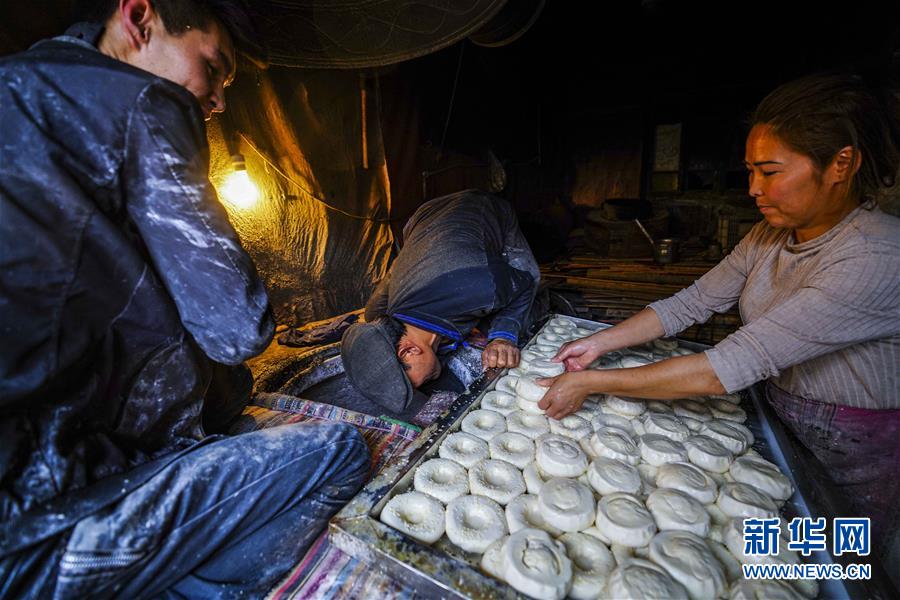 7月7日,在喀什古城景区一间馕铺里,商贩在打馕。 新华社记者 赵戈 摄