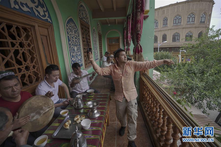 7月7日,在喀什古城景区里一座百年茶馆,游客和当地居民一起喝茶消夏。 新华社记者 赵戈 摄