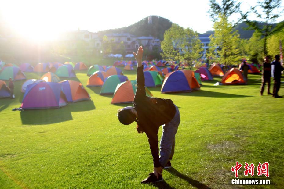 7月7日,小暑节气,持续的高温“炙烤”,多地发布高温黄色和红色预警,数千游客来到河南洛阳伏牛山清凉界海拔1700米的腹地安营扎寨,避暑纳凉。图为游客山中练瑜伽。中新社记者 王中举 摄