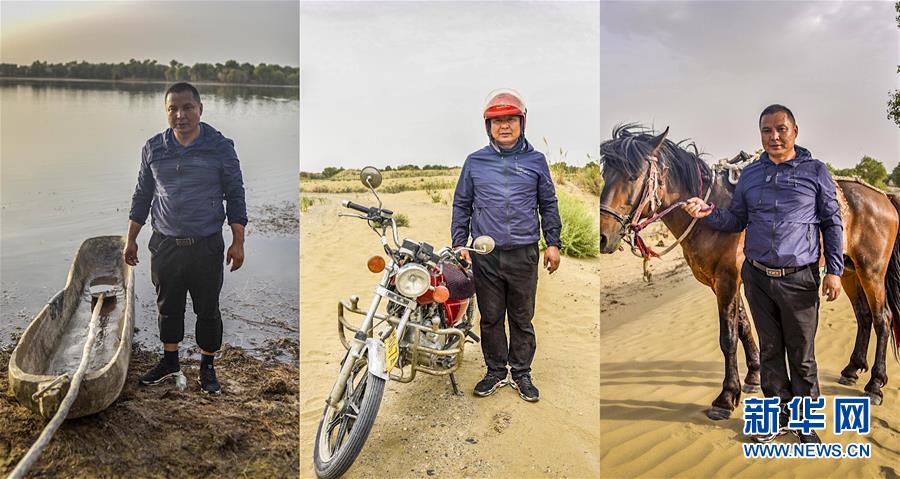 这是艾力·尼亚孜巡查胡杨时与卡盆(左)、摩托车(中)和马三种交通工具的合影(拼版照片)。新华社记者 赵戈 摄