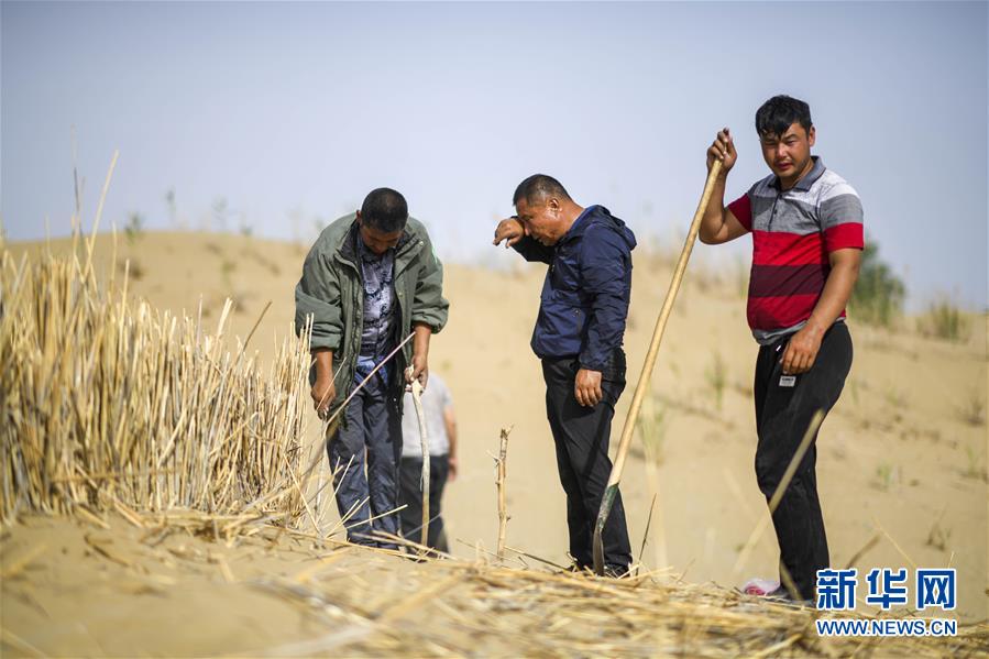 在尉犁县阿其克沙化土地封禁保护区试点项目区域,艾力·尼亚孜(中)和同事们扎草方格(6月20日摄)。新华社记者 赵戈 摄
