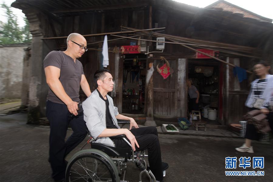 张海林推着轮椅送吴元渺去参加一次爱心服务队的公益活动(6月27日摄)。 新华社记者 翁忻旸 摄