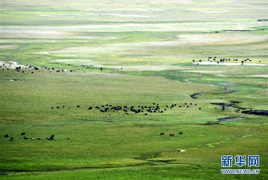 7月7日,在四川省阿坝藏族羌族自治州红原县的邛溪镇热坤村,牦牛在草原上吃草。 新华社记者 周相吉 摄
