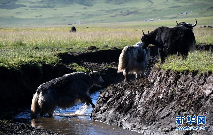 7月8日,在四川省阿坝藏族羌族自治州红原县的邛溪镇热坤村,几只牦牛在草原上。新华社记者 周相吉 摄