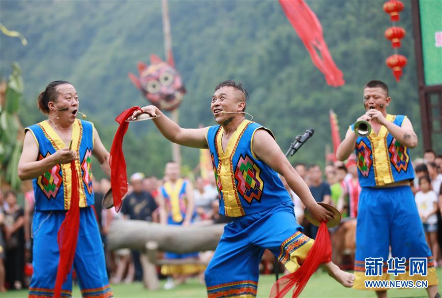 7月8日,几名男子在表演打溜子。 当日是农历六月初六,湖南省张家界市举办土家族“六月六”民俗文化节活动。当地群众身着盛装,展示农耕舞、茅古斯、打溜子等原汁原味的土家族农耕文化,欢庆“六月六”。 新华社发(吴勇兵 摄)