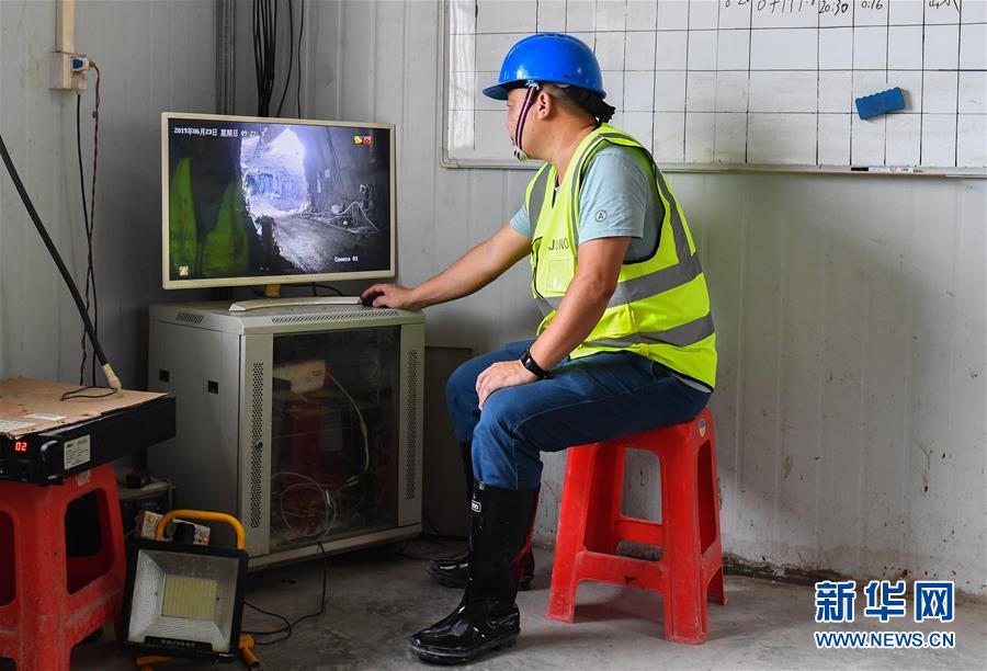 在江门中微子实验地下实验室施工项目部,中国水电六局工程人员监看地下施工情况(6月23日摄)。 新华社记者 刘大伟 摄