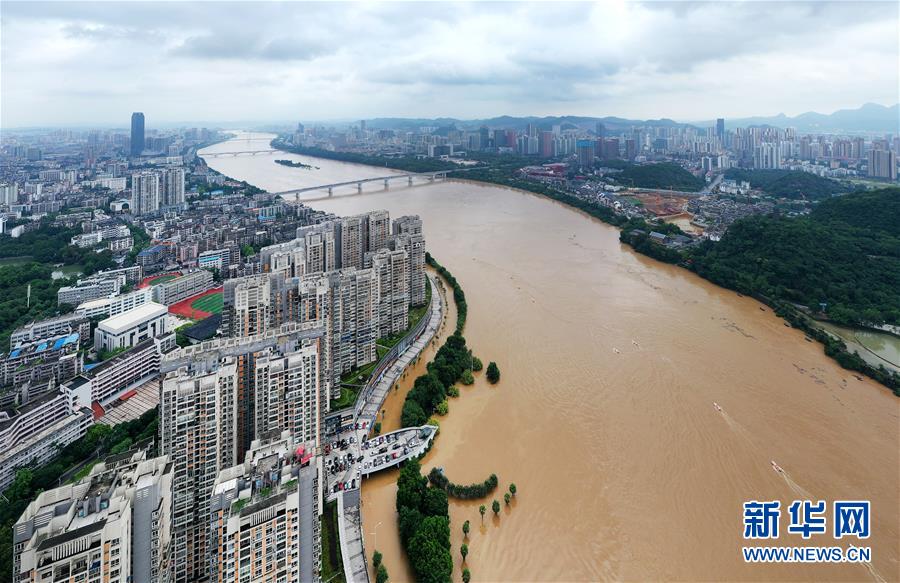 7月8日,广西柳州市滨江东路被上涨的洪水淹没(无人机拍摄)。 受持续强降雨影响,广西柳州境内的柳江水位暴涨。7月8日10时,柳江柳州水文站出现洪峰水位82.41米,接近警戒水位,柳州市区部分沿江低洼地带被淹。 新华社发(黎寒池 摄)