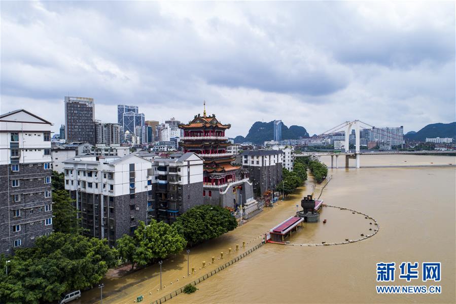 7月8日,广西柳州市滨江西路被上涨的洪水淹没(无人机拍摄)。 受持续强降雨影响,广西柳州境内的柳江水位暴涨。7月8日10时,柳江柳州水文站出现洪峰水位82.41米,接近警戒水位,柳州市区部分沿江低洼地带被淹。 新华社发(李斌 摄)