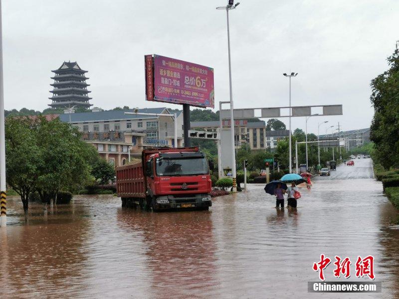 受连日来强降雨和上游来水影响,湘江三大支流之一的洣水河水位急涨。至7月8日19时,洣水河水位达74.41米,较正常水位提升近2.5米。持续走高的水位给湖南攸县城区排渍带来较大压力,造成部分地区出现内涝现象。图为大货车涉水通过县城中心大道与内环路交叉路口。蔡晓雅 摄