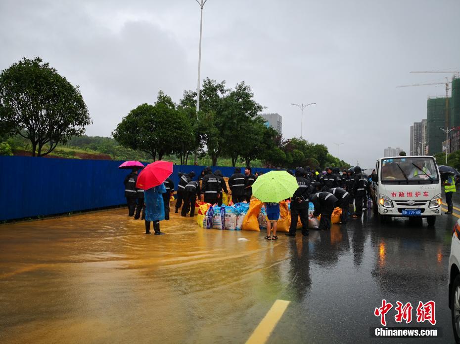 受连日来强降雨和上游来水影响,湘江三大支流之一的洣水河水位急涨。至7月8日19时,洣水河水位达74.41米,较正常水位提升近2.5米。持续走高的水位给湖南攸县城区排渍带来较大压力,造成部分地区出现内涝现象。图为攸县中心大道,市政部门疏通下水管道。蔡晓雅 摄
