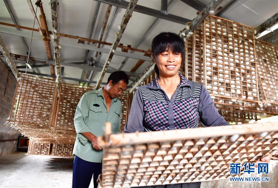 7月9日,在广西柳州市柳北区石碑坪镇古城村,脱贫户韦新凤(右)在摘蚕茧。韦新凤一家通过发展桑蚕养殖,已于2016年实现脱贫。新华社记者 黄孝邦 摄
