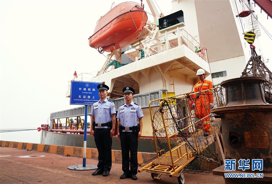 7月9日,曹妃甸出入境边防检查站民警在曹妃甸港区矿石码头执勤。新华社记者 杨世尧 摄
