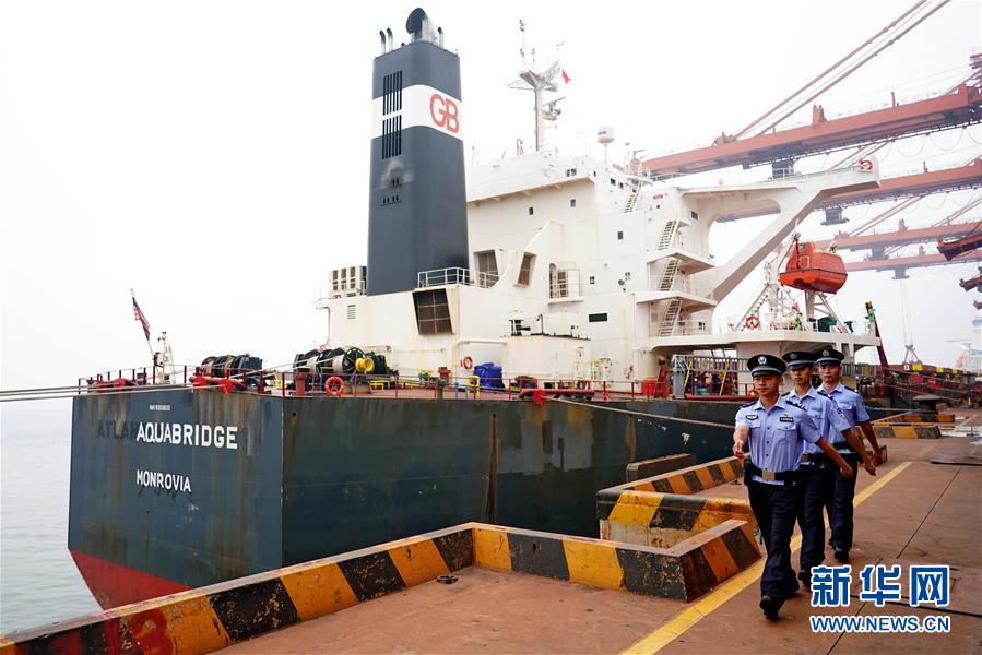 7月9日,曹妃甸出入境边防检查站民警在曹妃甸港区矿石码头巡逻。新华社记者 杨世尧 摄