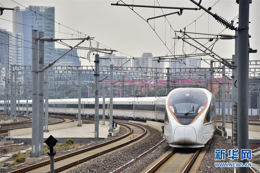 7月9日,一列开往上海虹桥的复兴号动车组列车驶出北京南站。新华社发(杨宝森摄)