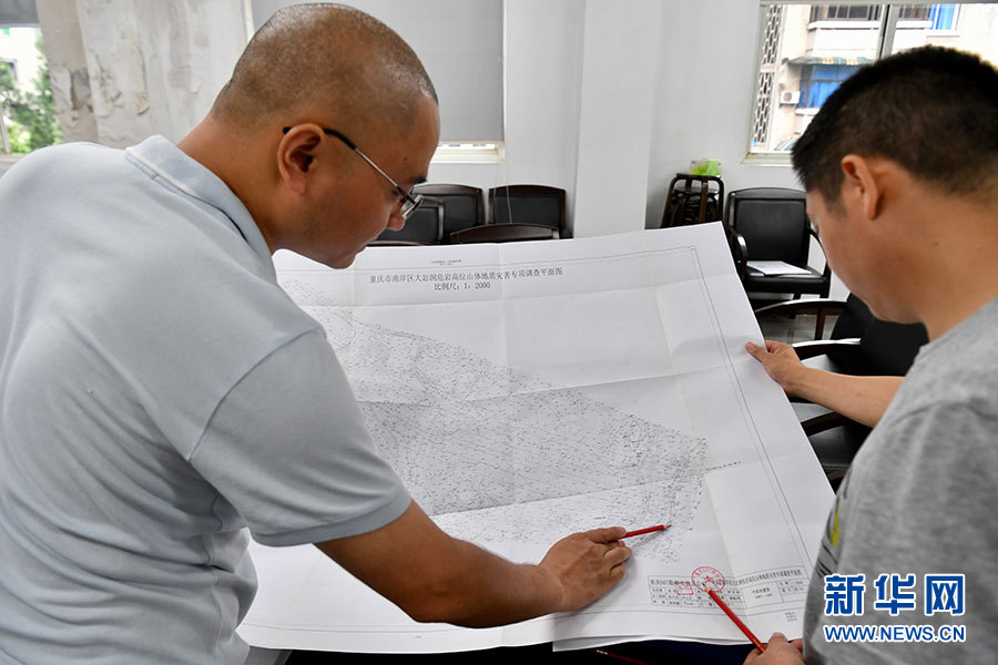 在汛期,地质“体检师”每天都有外出现场勘查的任务。出发前,队员们都会仔细了解当地的地形地貌。“通过地形图纸,可以有个大致了解,这样到了现场也更能有的放矢”, 陈良斌说道。新华网发(郭旭 摄)