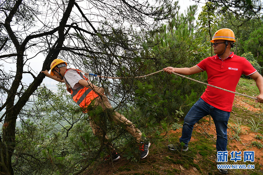 完成危岩的“诊断”后,陈良斌系上安全绳,朝岩边走去,他拿出地质锤向岩石轻轻敲打,用耳朵倾听岩石回应的“声音”。一比划一敲打,地质队员对该区域的地质情况,就有了个大概了解。新华网发(郭旭 摄)