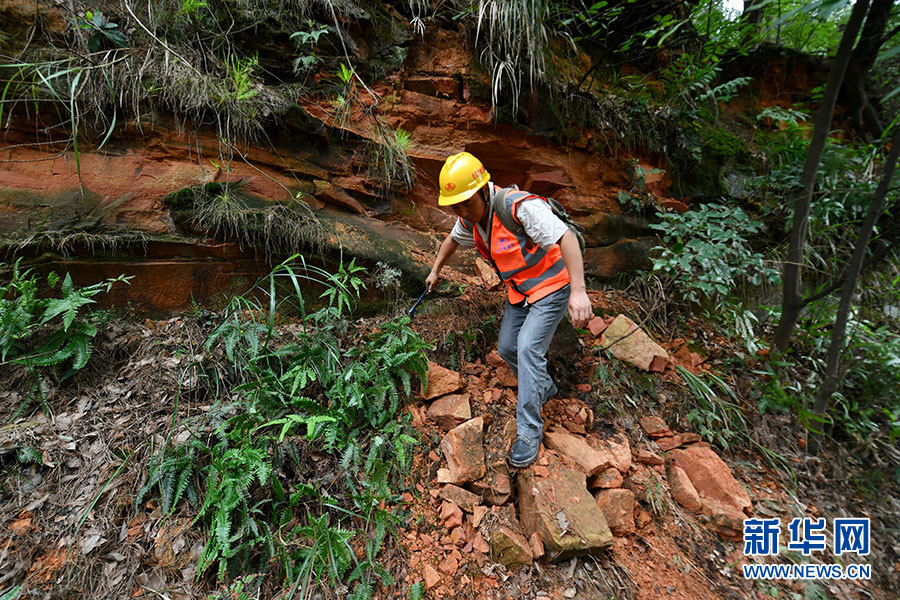 除了日常“体检”,地质队员还要提前分析“病情”。在陈良斌拿着罗盘比划时,魏德勇则沿着危岩下的马路徘徊观望。新华网发(郭旭 摄)