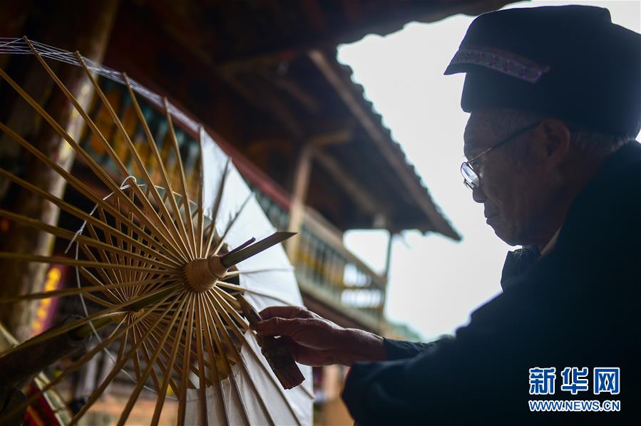 张荣华老人在家中裱伞,这道工序需要反复裱糊多层(7月9日摄)。 云南壮族水竹花伞制作技艺主要流传于云南省文山州丘北县一带,传承至今已有400余年历史。花伞选用当地优质水竹为原材料,伞架轻盈强韧,伞面油光水滑,内饰编织七彩纷呈。水竹花伞除了用作挡阳遮雨的日常用品外,也是当地嫁娶婚俗礼仪中不可或缺的物品。 在丘北县官寨乡向阳村,89岁的张荣华老人和孙子张国庆是当地这一技艺仅存的传承人。锯竹、刨木、劈条、刨青、锯槽、装键、绕伞圈、裱伞、印花、穿饰线、上桐油……每把伞都要经过80余道精细繁琐的工艺,历时三至五天,纯手工制作,匠心尽显。 新华社记者江文耀摄