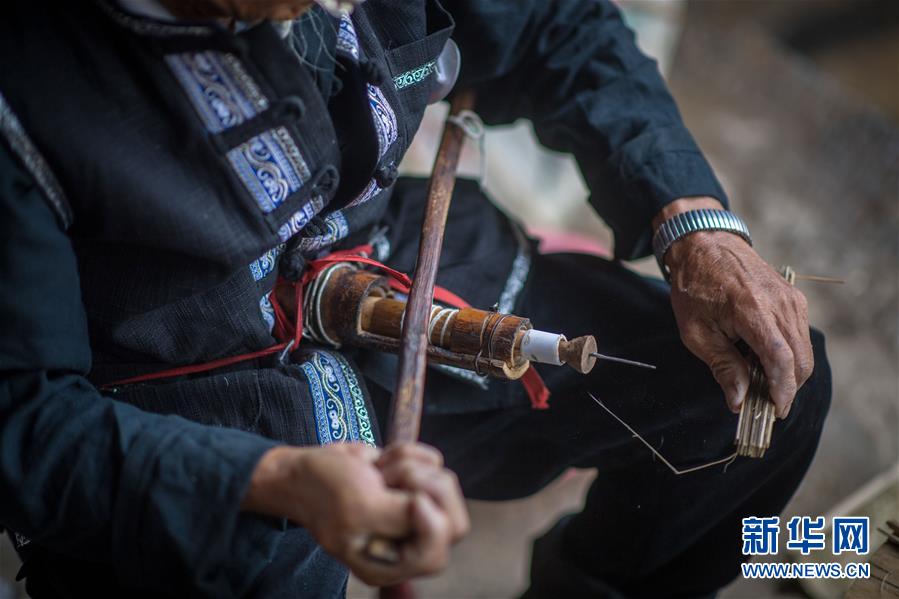 张荣华老人使用专门的工具为伞骨钻孔(7月9日摄)。 云南壮族水竹花伞制作技艺主要流传于云南省文山州丘北县一带,传承至今已有400余年历史。花伞选用当地优质水竹为原材料,伞架轻盈强韧,伞面油光水滑,内饰编织七彩纷呈。水竹花伞除了用作挡阳遮雨的日常用品外,也是当地嫁娶婚俗礼仪中不可或缺的物品。 在丘北县官寨乡向阳村,89岁的张荣华老人和孙子张国庆是当地这一技艺仅存的传承人。锯竹、刨木、劈条、刨青、锯槽、装键、绕伞圈、裱伞、印花、穿饰线、上桐油……每把伞都要经过80余道精细繁琐的工艺,历时三至五天,纯手工制作,匠心尽显。 新华社记者江文耀摄