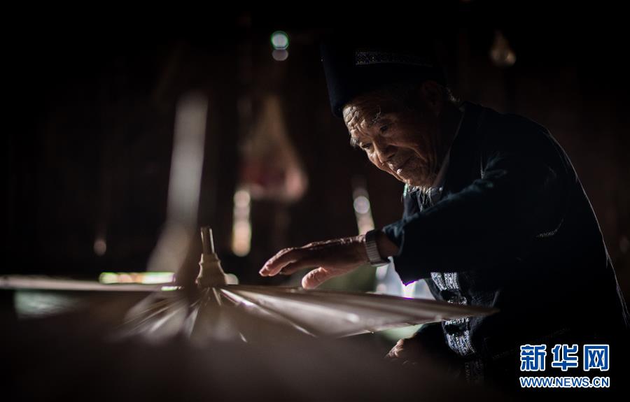 张荣华老人在家中查看裱糊完毕正在晾晒的水竹花伞(7月9日摄)。 云南壮族水竹花伞制作技艺主要流传于云南省文山州丘北县一带,传承至今已有400余年历史。花伞选用当地优质水竹为原材料,伞架轻盈强韧,伞面油光水滑,内饰编织七彩纷呈。水竹花伞除了用作挡阳遮雨的日常用品外,也是当地嫁娶婚俗礼仪中不可或缺的物品。 在丘北县官寨乡向阳村,89岁的张荣华老人和孙子张国庆是当地这一技艺仅存的传承人。锯竹、刨木、劈条、刨青、锯槽、装键、绕伞圈、裱伞、印花、穿饰线、上桐油……每把伞都要经过80余道精细繁琐的工艺,历时三至五天,纯手工制作,匠心尽显。 新华社记者江文耀摄