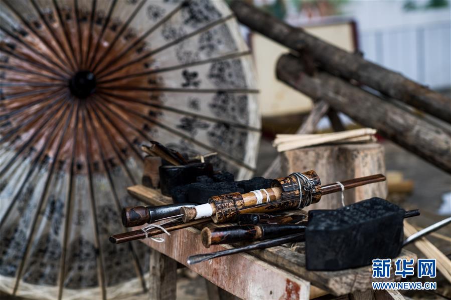 制作水竹花伞需要使用到数十种专门的工具,这是其中的一部分(7月9日摄)。 云南壮族水竹花伞制作技艺主要流传于云南省文山州丘北县一带,传承至今已有400余年历史。花伞选用当地优质水竹为原材料,伞架轻盈强韧,伞面油光水滑,内饰编织七彩纷呈。水竹花伞除了用作挡阳遮雨的日常用品外,也是当地嫁娶婚俗礼仪中不可或缺的物品。 在丘北县官寨乡向阳村,89岁的张荣华老人和孙子张国庆是当地这一技艺仅存的传承人。锯竹、刨木、劈条、刨青、锯槽、装键、绕伞圈、裱伞、印花、穿饰线、上桐油……每把伞都要经过80余道精细繁琐的工艺,历时三至五天,纯手工制作,匠心尽显。 新华社记者江文耀摄