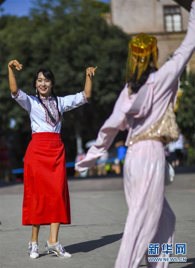 在喀什古城景区开城仪式上,“古丽的家”特色庭院店主沙拉麦提古丽·卡日(左)与游客一道跳起了欢快的麦西来甫(7月8日摄)。 新疆素有“歌舞之乡”美誉。在喀什古城景区里,歌舞也是当地人民生活中不可缺少的一部分。欣赏独具风情的歌舞也成了游客们游览古城的重要内容。 2019年喀什古城景区旅游发展迅速。景区管委会提供的数据显示,上半年古城景区接待游客人数超过31万人次,同比增长超过九成。 新华社记者 赵戈 摄