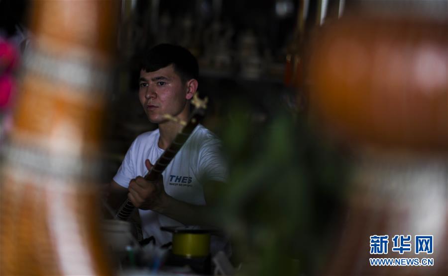 喀什古城景区“老城艾山玉山手工木器艺术品展览店”店主玉买尔江·玉山在弹奏民族乐器(7月8日摄)。 新疆素有“歌舞之乡”美誉。在喀什古城景区里,歌舞也是当地人民生活中不可缺少的一部分。欣赏独具风情的歌舞也成了游客们游览古城的重要内容。 2019年喀什古城景区旅游发展迅速。景区管委会提供的数据显示,上半年古城景区接待游客人数超过31万人次,同比增长超过九成。 新华社记者 赵戈 摄