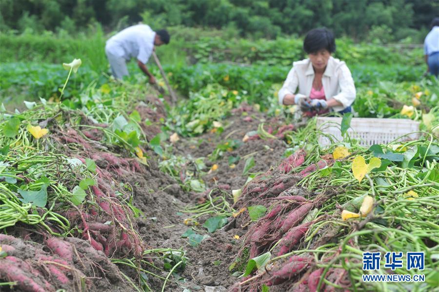 7月11日,浙江省杭州市临安区天目山镇九里村淼楠小香薯合作社的社员在采收小香薯。 新华社发(胡剑欢 摄)