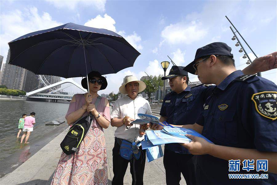 7月11日,天津海事局执法人员(右一、二)向过往市民发放航海日宣传材料。 当日,天津海事局在天津大悲院码头开展主题为“再扬丝路风帆 共筑蓝色梦想”的中国航海日活动,通过现场发放材料、互动演示和现场模拟等方式让市民和游客进一步认识海洋,关注海上安全。 2005年,国务院决定每年7月11日为“中国航海日”。 新华社记者 岳月伟 摄