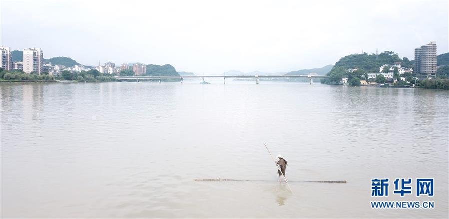 7月11日,方恕云站在一根毛竹上横渡新安江(无人机拍摄)。 54岁的浙江建德农民方恕云,自少年时就开始练习站在一根毛竹上渡江的绝技,还能做俯卧撑、抬脚跳等动作,在水中“如履平地”。 新华社记者 翁忻旸 摄