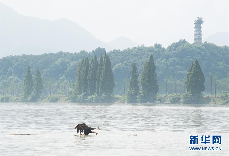 7月11日,方恕云在毛竹上做俯卧撑。 54岁的浙江建德农民方恕云,自少年时就开始练习站在一根毛竹上渡江的绝技,还能做俯卧撑、抬脚跳等动作,在水中“如履平地”。 新华社记者 翁忻旸 摄